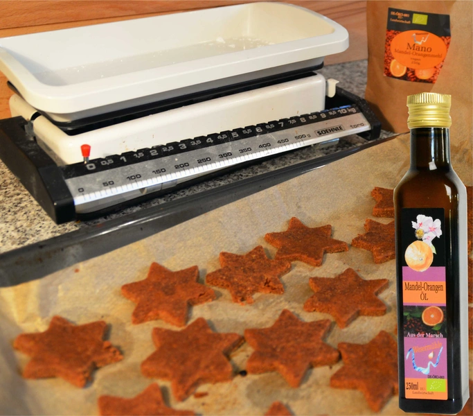 Das Mandel-Orangenmehl verleiht den Sternen die Pfefferkuchenfarbe und das Öl den Orangenduft.
