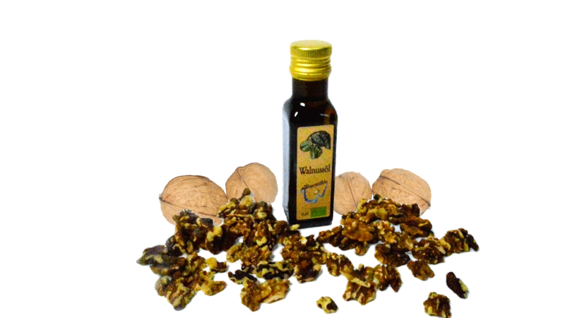 Wir rösten die Walnüsse nicht vor dem Pressen, um die wertvollen Omege-3-Fettsäuren nicht zu zerstören. Frisch gepresst duftet es nach Walnüssen und lockt zur Zubereitung von Blattsalaten, speziell auch Feldsalat.